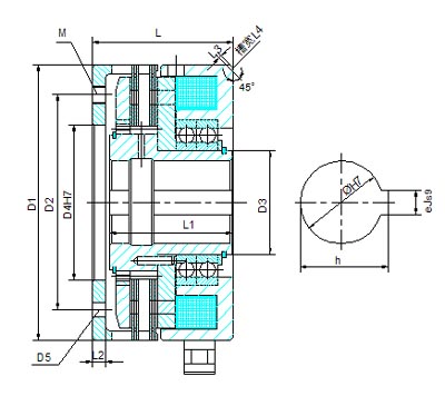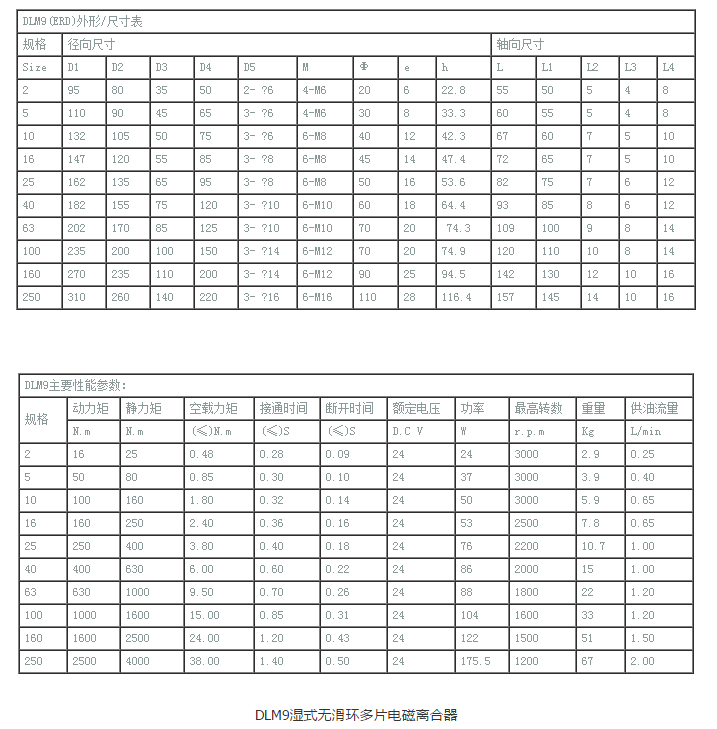 DLM9湿式无滑环多片电磁离合器是我国80年代中期引进西德ERD品种,它与DLM3结构基本相同,但在结构形式上具有的改进,其内摩擦片两侧有阿基米德轴旋柱,破坏油面张力,外摩擦片有正弦波,从而达到较低的空载损耗,为了减少轴承游隙,增加不同厚度的调整垫。