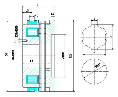 该产品是60年代引进前苏联M系列通过一系列改进而演变成目前结构形式。其结构特点为湿式多片选用在花键轴通体联、接安装方便、达到一般性能要求。缺点是同轴磁化较严重,属于散件自行组装,由于采用电刷与导电环通电往往对转速有特定要求空载损耗大。